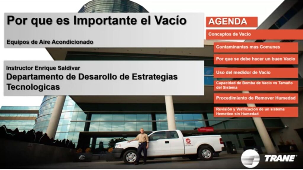 ¡Domina el vacío y protege tus equipos! Únete a este curso enfocado en la remoción de humedad y contaminantes mediante las mejores prácticas para garantizar un sistema libre de impurezas. Imparte: ing. Enrique Saldivar (Trane México) Lo que aprenderás: Conceptos de remoción de humedad. Selección de bomba y uso del vacuómetro. Verificación de un sistema totalmente hermético.